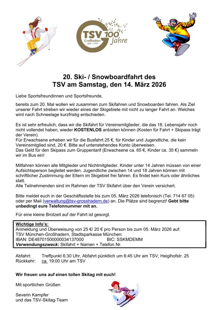 Am Samstag, 14. März 2026 findet die 20. TSV-Ski-/Snowboardfahrt statt.