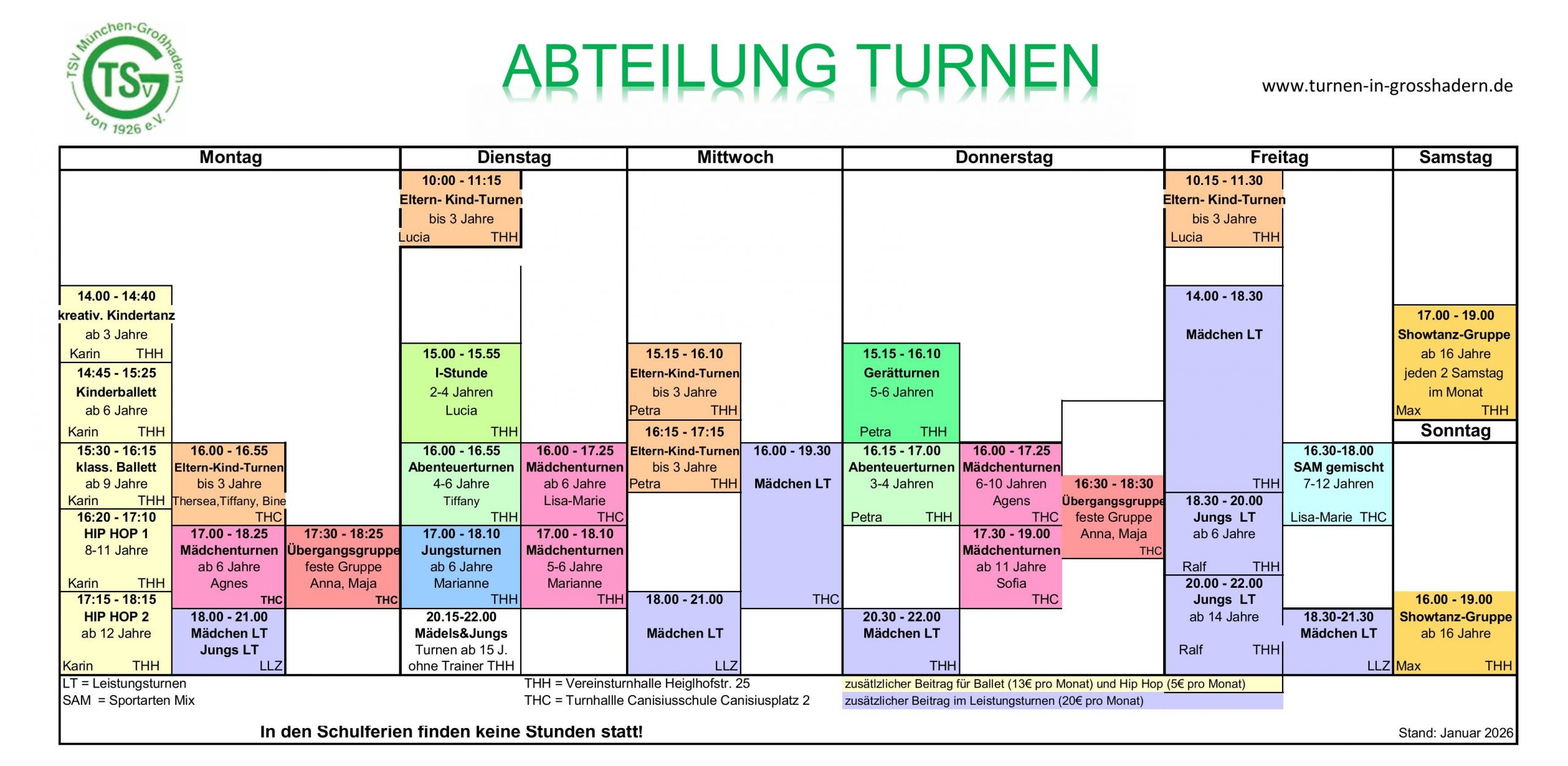 | Turnen | Showtanz/Akrobatik bis 18 Jahre | 14,00 | 2,00 | 16,00 | monatlich |