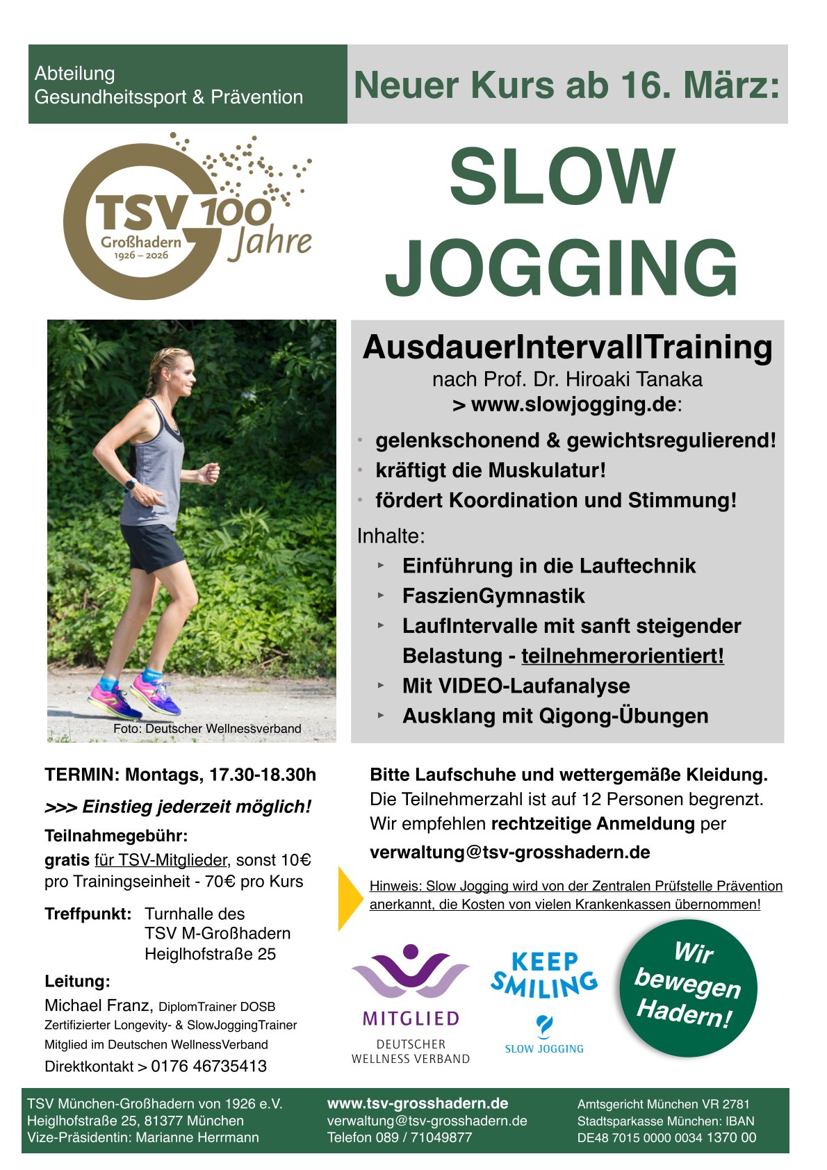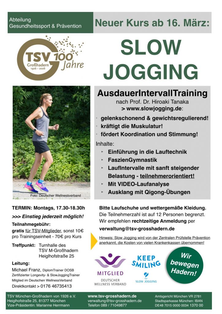 Ab 16. März bieten wir einen neuen Kurs „Slow Jogging“ an. Ein AusdauerIntervallTraining nach Prof. Dr. Hiroaki Tanaka.