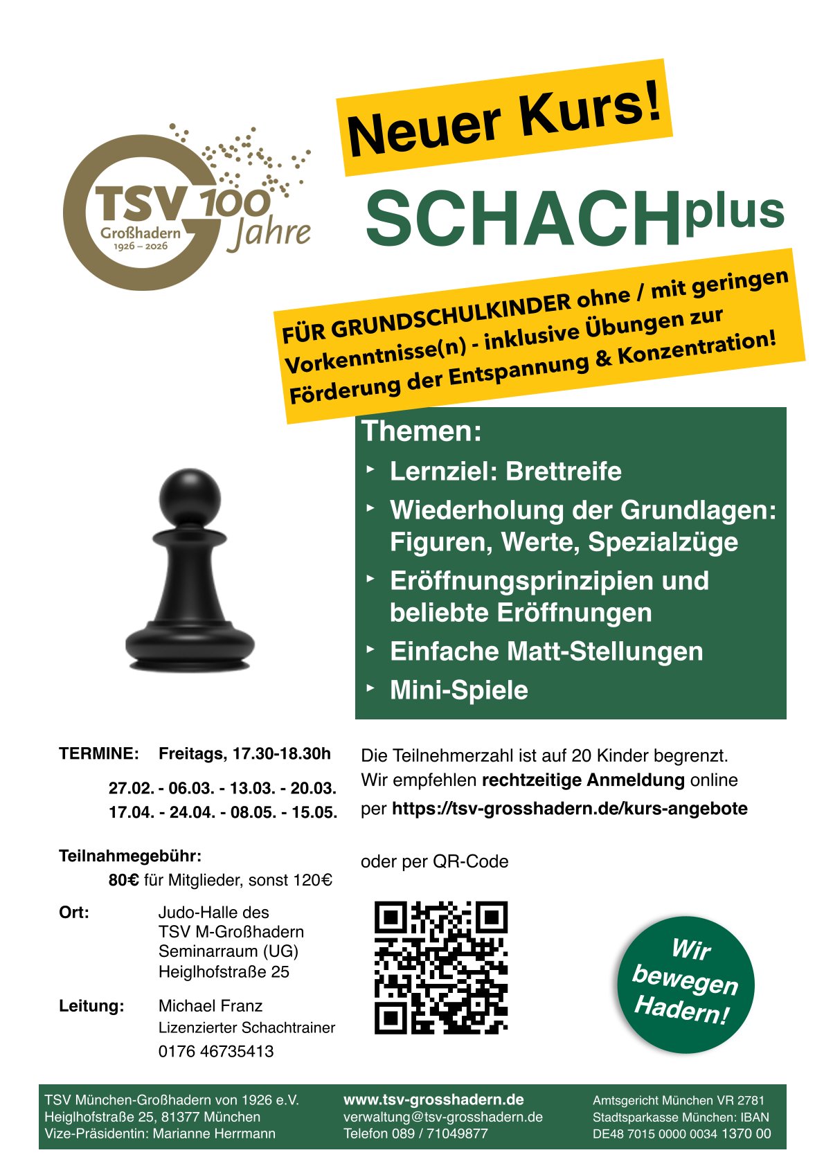 Am Freitag, 27. Februar 2026 startet der neue Schach-Kurs für Grundschulkinder.
